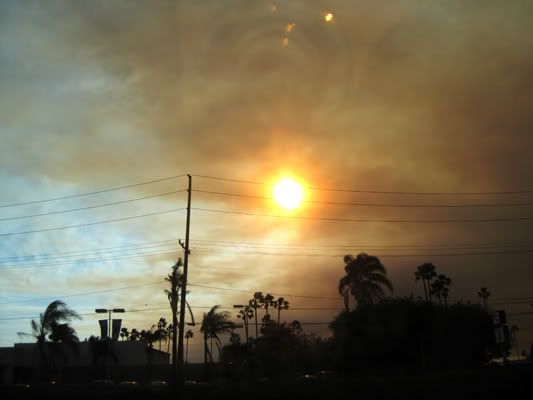 The smoke cloud is not just fueled by that fire. Apparently there is a bigger fire ( btw the fires are apparently still burning to this point of time but contained ) up in north LA just north of the sale area!!!! =________=. As we were driving on the 5 towards LA past disneyland, the sun turned red blanketed by the smoke and the air turned bad. Once we reached knottsberry in bueno park it started pelting ash onto our windshield =________=. We hear reports of ppl evacuating their cars on the highway up in north LA on the radio and with the car not having aircon we could smell the smoke thickly in the air..and visibility on the highway worsen.